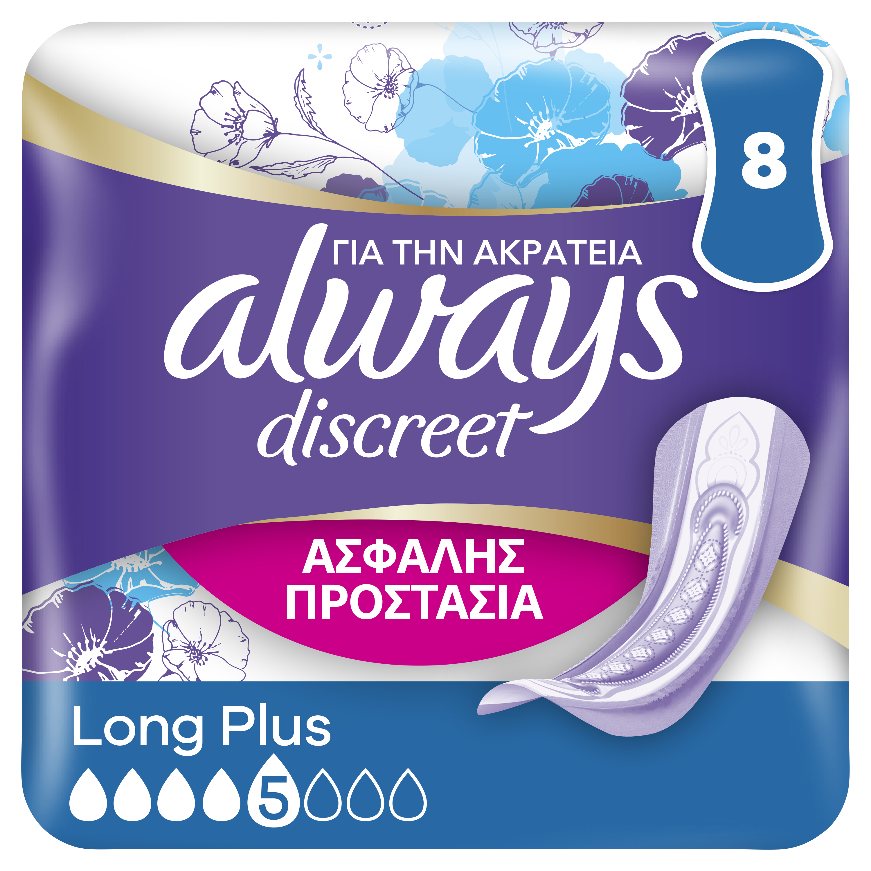 Ιδανικές για πιο έντονες ανάγκες. Οι Always Discreet Σερβιέτες για την Ακράτεια Long Plus είναι εξαιρετικά ασφαλείς και σχεδόν δεν τις αισθάνεστε. Έχουν σχεδιαστεί ώστε να σας προσφέρουν επιπλέον κάλυψη και προστασία ώστε να πάψετε να ανησυχείτε για διαρροές. Η μοναδική τους δομή προσφέρει ισχυρή προστασία με πολύ λεπτό πυρήνα ώστε να μην έχετε να επιλέξετε μεταξύ της άνεσης και της προστασίας. Αν το φτέρνισμα ή το γέλιο σας προκαλεί διαρροές ουροδόχου κύστης, οι σερβιέτες Always Discreet Plus Long Plus σας προσφέρουν ιδανική προστασία.