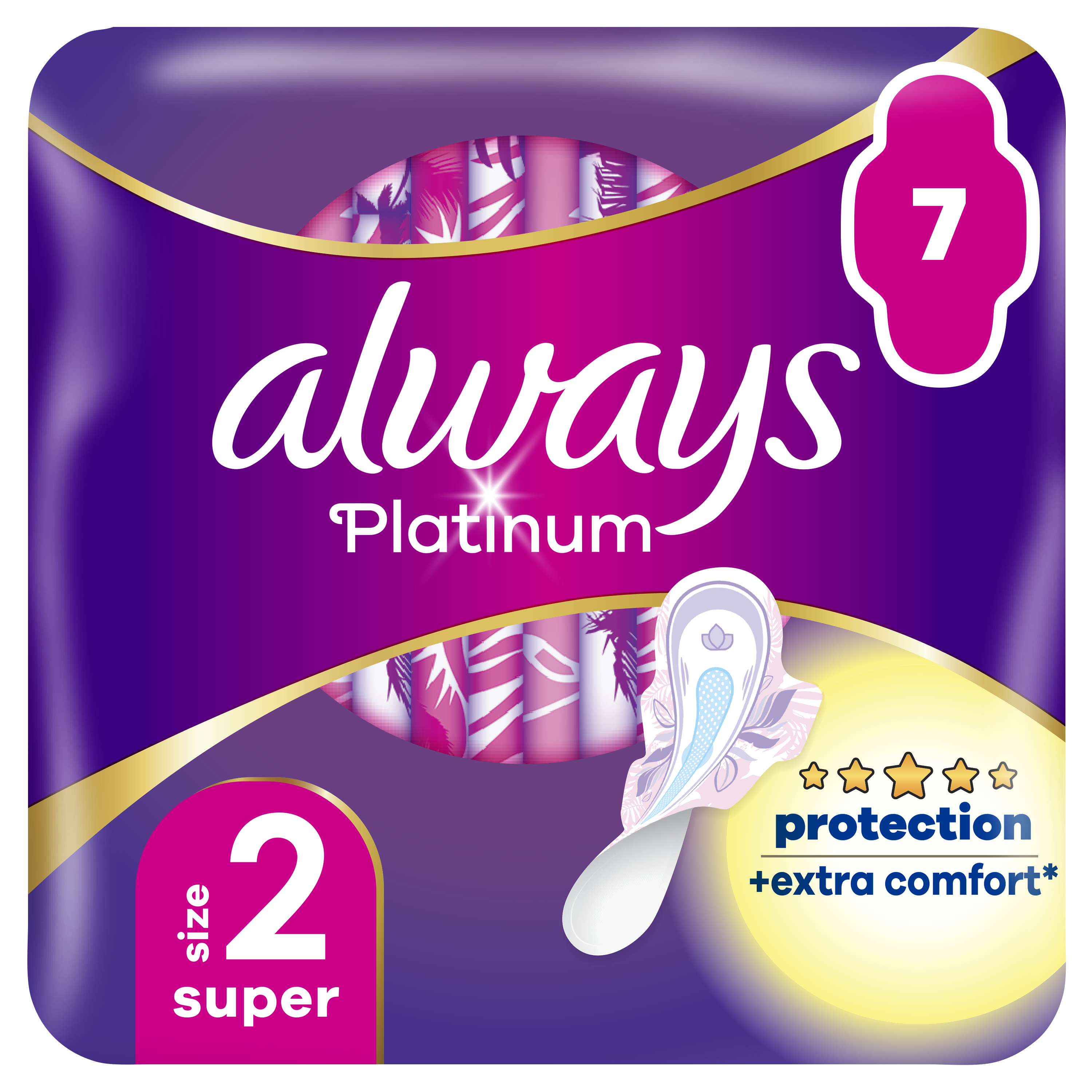Οι σερβιέτες Always Platinum με φτερά ComfortLock είναι σχεδιασμένες για να σας προσφέρουν καλύτερη εφαρμογή*, με μηδενικές διαρροές, χωρίς μετακινήσεις και απόλυτη άνεση. Με τις σερβιέτες Always Platinum, η περίοδός σας είναι το τελευταίο πράγμα που θα σκέφτεστε. Οι Always Platinum Super (Μέγεθος 2) με φτερά για καθημερινή χρήση, αν έχετε μέτρια ροή. Δοκιμάστε την Always Platinum Secure Night (Μέγεθος 4), τις καλύτερες σερβιέτες Always Platinum για προστασία κατά τη διάρκεια της νύχτας. *σε σχέση με το προηγούμενο προϊόν