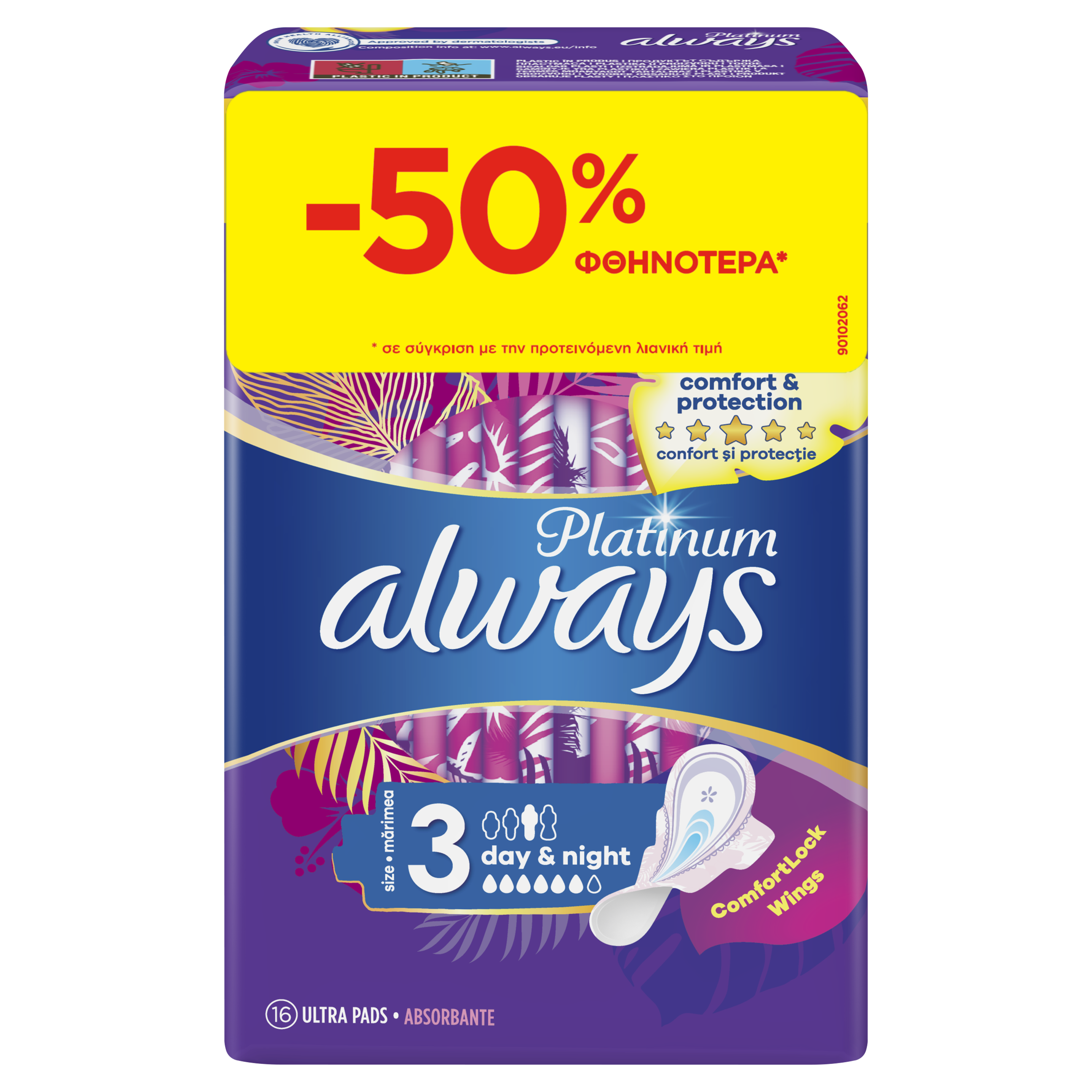 Οι σερβιέτες Always Platinum έχουν σχεδιαστεί με σύστημα Zero Feel, για να περνάς την κάθε σου ημέρα χωρίς ανησυχία. Αυτές οι εξαιρετικές σερβιέτες προσφέρουν 5 φορές περισσότερη άνεση χάρη στα μεταξένια τους φτερά, τα τρισδιάστατα προστατευτικά φράγματα LeakGuard, τα 1000 απαλά μικρο-μαξιλαράκια, τον σχεδιασμό Soft&Fit και την τεχνολογία OdourLock. Οι Always Platinum Night (Μέγεθος 3) με φτερά συνιστώνται για χρήση κατά τη διάρκεια της νύχτας ή αν έχεις μέτρια έως βαριά ροή. Δοκιμάστε την Always Platinum Secure Night (Μέγεθος 4), την καλύτερη σερβιέτα Always Platinum για προστασία κατά τη διάρκεια της νύχτας.