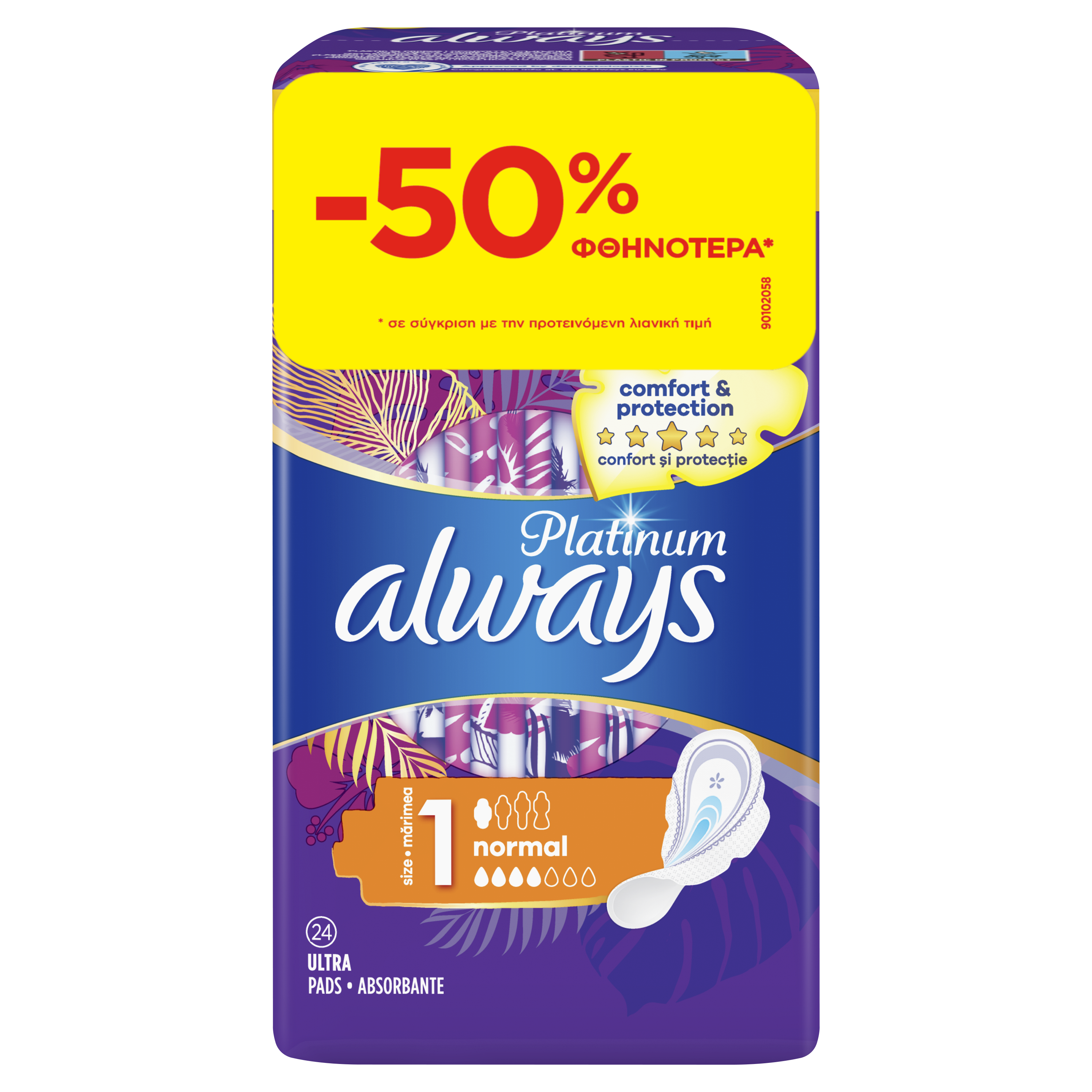 Οι σερβιέτες Always Platinum έχουν σχεδιαστεί με σύστημα Zero Feel, για να περνάς την κάθε σου ημέρα χωρίς ανησυχία. Αυτές οι εξαιρετικές σερβιέτες προσφέρουν 5 φορές περισσότερη άνεση χάρη στα μεταξένια τους φτερά, τα τρισδιάστατα προστατευτικά φράγματα LeakGuard, τα 1000 απαλά μικρο-μαξιλαράκια, τον σχεδιασμό Soft&Fit και την τεχνολογία OdourLock. Οι Always Platinum Normal (Μέγεθος 1) με φτερά συνιστώνται για καθημερινή χρήση, αν έχεις ελαφριά έως μέτρια ροή. Δοκιμάστε την Always Platinum Secure Night (Μέγεθος 4), την καλύτερη σερβιέτα Always Platinum για προστασία κατά τη διάρκεια της νύχτας.