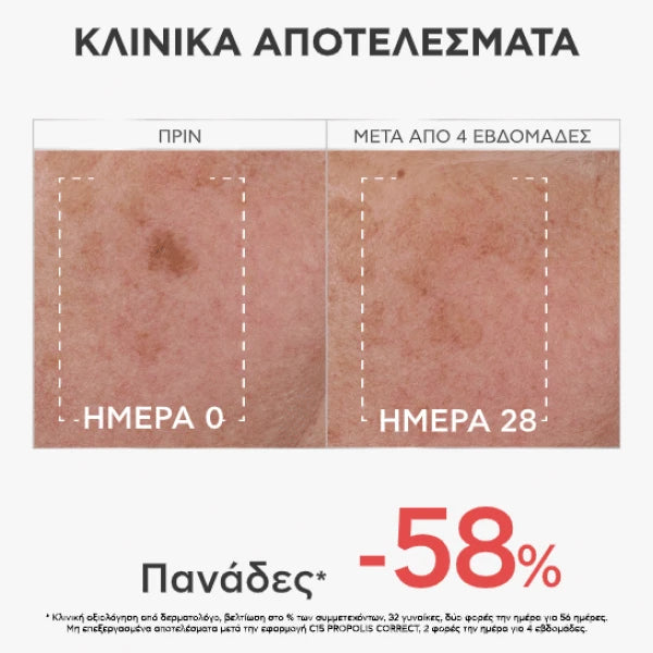 O ΟΡΟΣ C15 PROPOLIS CORRECT αποτελεί έναν ισχυρό συνδυασμό αντιγήρανσης με βιταμίνες C & E και Πατενταρισμένη propolis AoX-CR*.