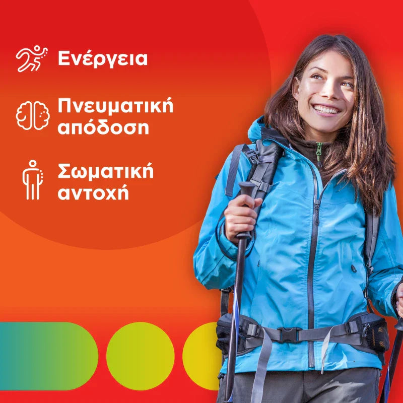 •     Ginseng, βιταμίνη D, σύμπλεγμα βιταμινών Β και σίδηρος που συμβάλλουν στη διατήρηση της καλής φυσικής κατάστασης.