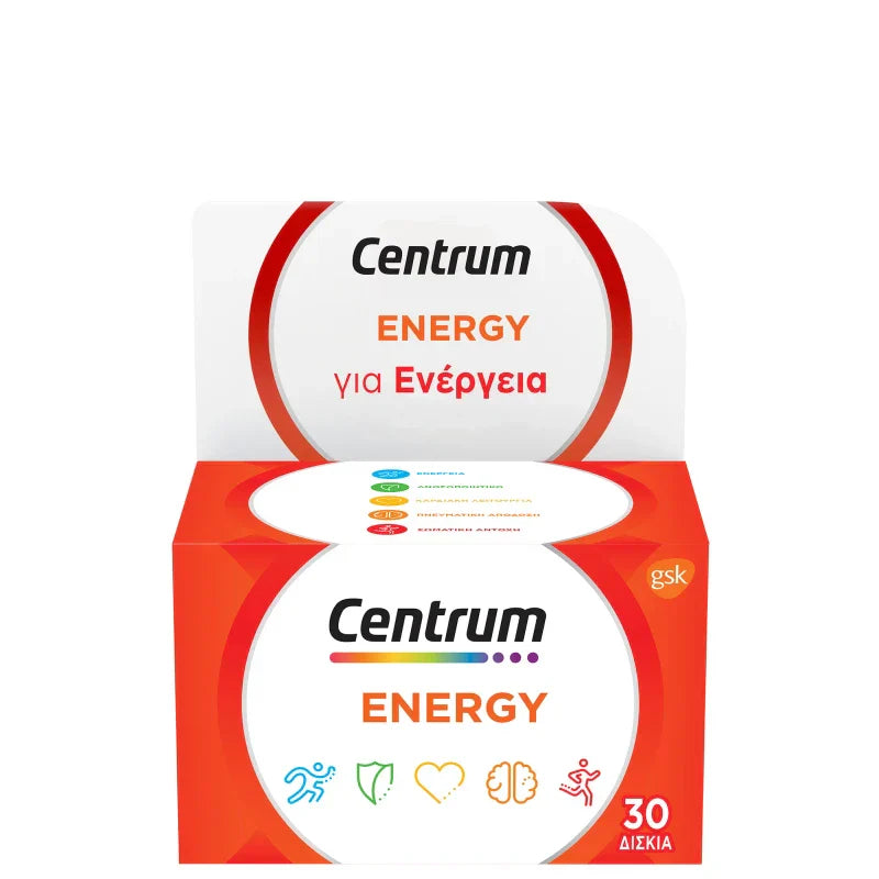 Centrum Energy 30δισκίαΣυμπλήρωμα διατροφής για ενήλικες με βιταμίνες, μέταλλα, Ginseng και Ginkgo Biloba.     Σύμπλεγμα Βιταμινών Β και σίδηρος που συμβάλλουν στην υποστήριξη των καθημερινών αναγκών για ενέργεια.     Βιταμίνη C , σελήνιο και ψευδάργυρος που συμβάλλουν στη φυσιολογική λειτουργία του ανοσοποιητικού συστήματος.     Βιταμίνη Β1 (Θειαμίνη) που συμβάλλει στη φυσιολογική λειτουργία της καρδιάς.     Ginkgo Biloba και παντοθενικό οξύ που συμβάλλουν στη γνωστική λειτουργία.     Ginseng, βιταμίνη D, σύμπλεγμα βιταμινών Β και σίδηρος που συμβάλλουν στη διατήρηση της καλής φυσικής κατάστασης.