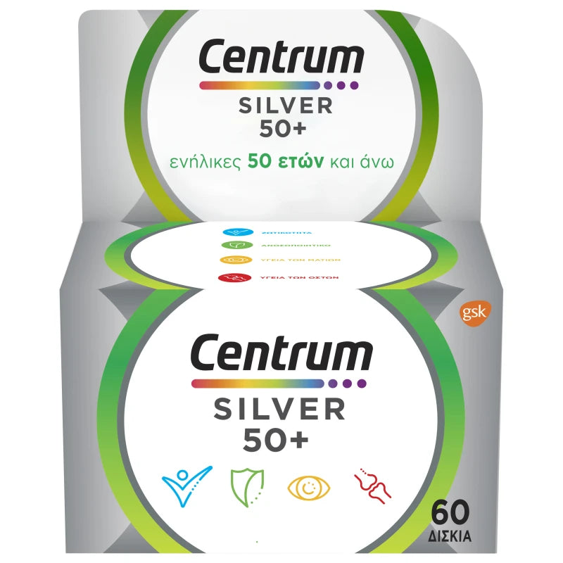 Το Centrum silver 50+ είναι ένα συμπλήρωμα διατροφής με προσαρμοσμένα επίπεδα βιταμινών, μετάλλων και ιχνοστοιχείων, ώστε να ανταποκρίνεται στις διατροφικές ανάγκες των ενηλίκων 50 ετών και άνω. Εύκολο στη λήψη, όπου και όποτε το χρειαστείτε. Κατάλληλο για ενήλικες, άνδρες και γυναίκες.