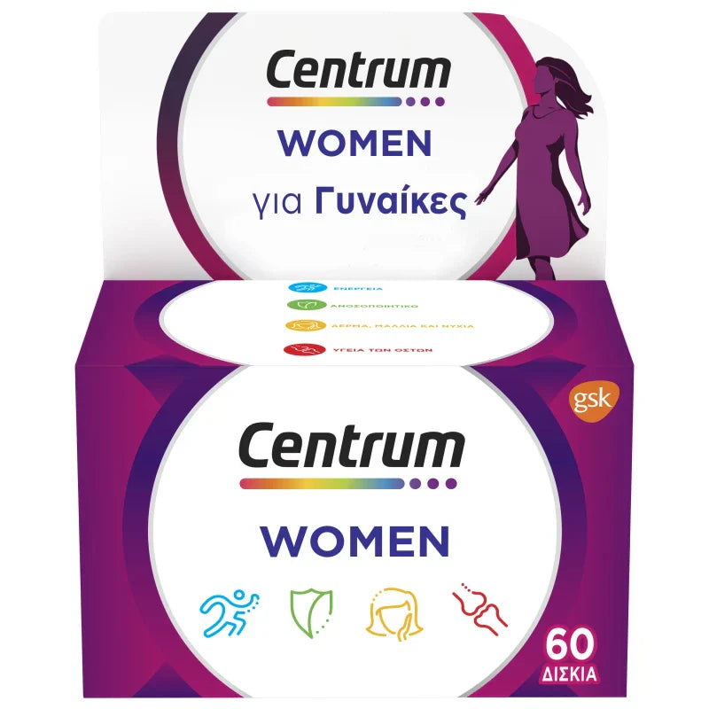 Το Centrum Women έχει ειδικά διαμορφωμένη σύνθεση βιταμινών, μετάλλων και ιχνοστοιχείων ώστε να ανταποκρίνεται στις διατροφικές ανάγκες του γυναικείου οργανισμού. Εύκολο στη λήψη, όπου και όποτε το χρειαστείτε. Κατάλληλο για ενήλικες και έφηβες 12 ετών και άνω.