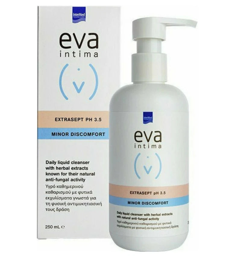 Το Eva Intima Wash Extrasept είναι απαλό υγρό καθημερινού καθαρισμού της ευαίσθητης περιοχής χωρίς σαπούνι, ειδικά σχεδιασμένο για να προσφέρει ανακούφιση και προστασία ιδίως σε περιπτώσεις λοιμώξεων ή υποτροπών οφειλόμενων σε μύκητες καθώς συνδυάζει την αντιμυκητιασική, αντιμικροβιακή και καταπραϋντική δράση βοτάνων όπως το θυμάρι,το φασκόμηλο και το αρκτιο τρίλοβο με την επουλωτική και αναπλαστική δράση του βοτάνου αζαντιράκτα.