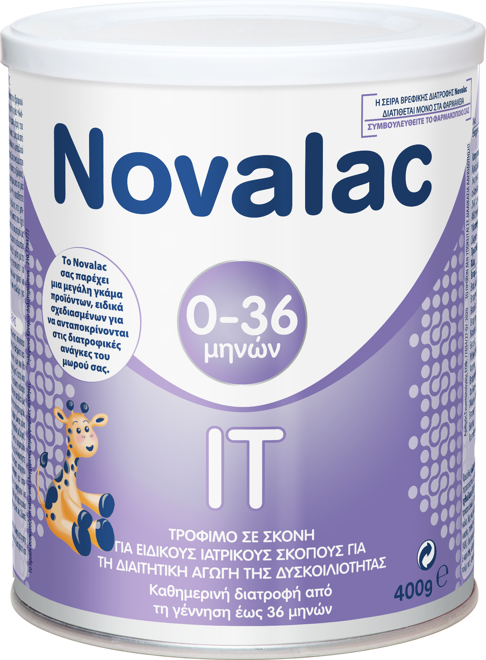 Το Novalac IT είναι ένα τρόφιμο σε σκόνη για ειδικούς ιατρικούς σκοπούς, για τη διαιτητική διαχείριση της δυσκοιλιότητας. Περιέχει λακτόζη ως μοναδική πηγή υδατανθράκων.