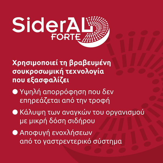 Το SiderAL®Forte αποτελεί μία σημαντική εξέλιξη στην αντιμετώπιση της έλλειψης σιδήρου γιατί χάρη σε μία προηγμένη τεχνολογία μεταφοράς και απόδοσης του σιδήρου στον οργανισμό προσφέρει μοναδικά οφέλη.